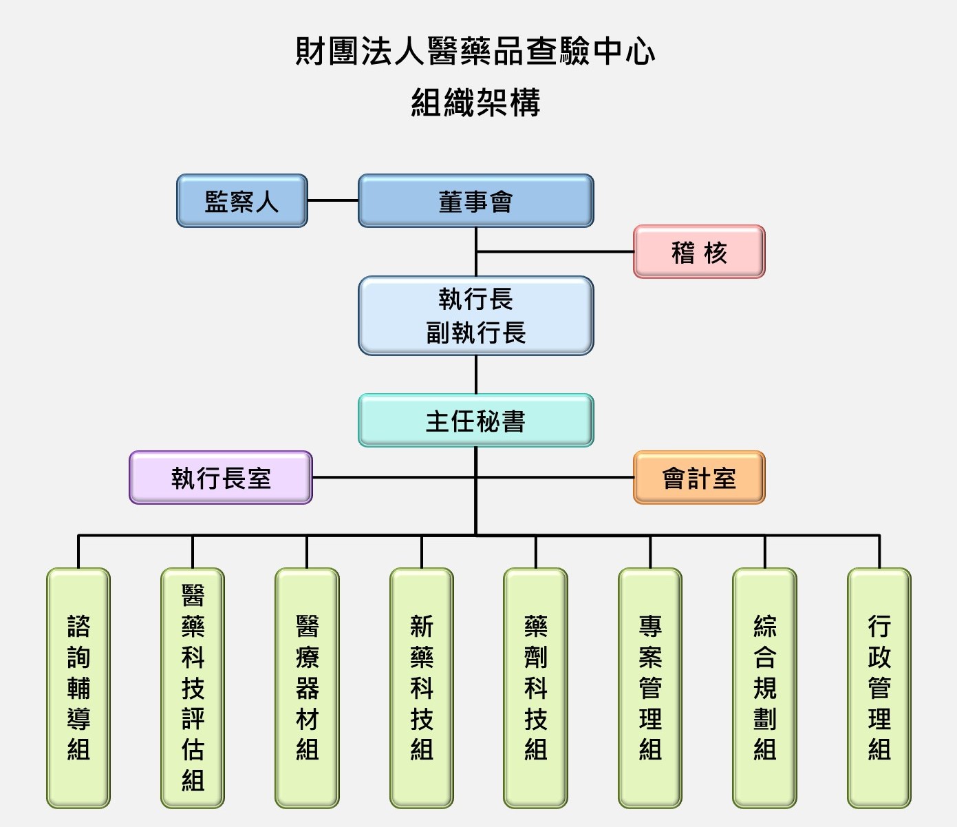 查驗中心為有效執行各項業務,在組織上設有執行長室、新藥科技組、藥劑科技組、醫療器材組、醫藥科技評估組、專案管理組、諮詢輔導組、綜合規劃組、行政管理組及會計室等單位。結合具醫學、藥學、化學、生物、統計、法律、醫工、醫檢、公共衛生、藥物經濟學、食品科學、食品營養及相關生命科學等專業專職人才,執行本中心各項業務。