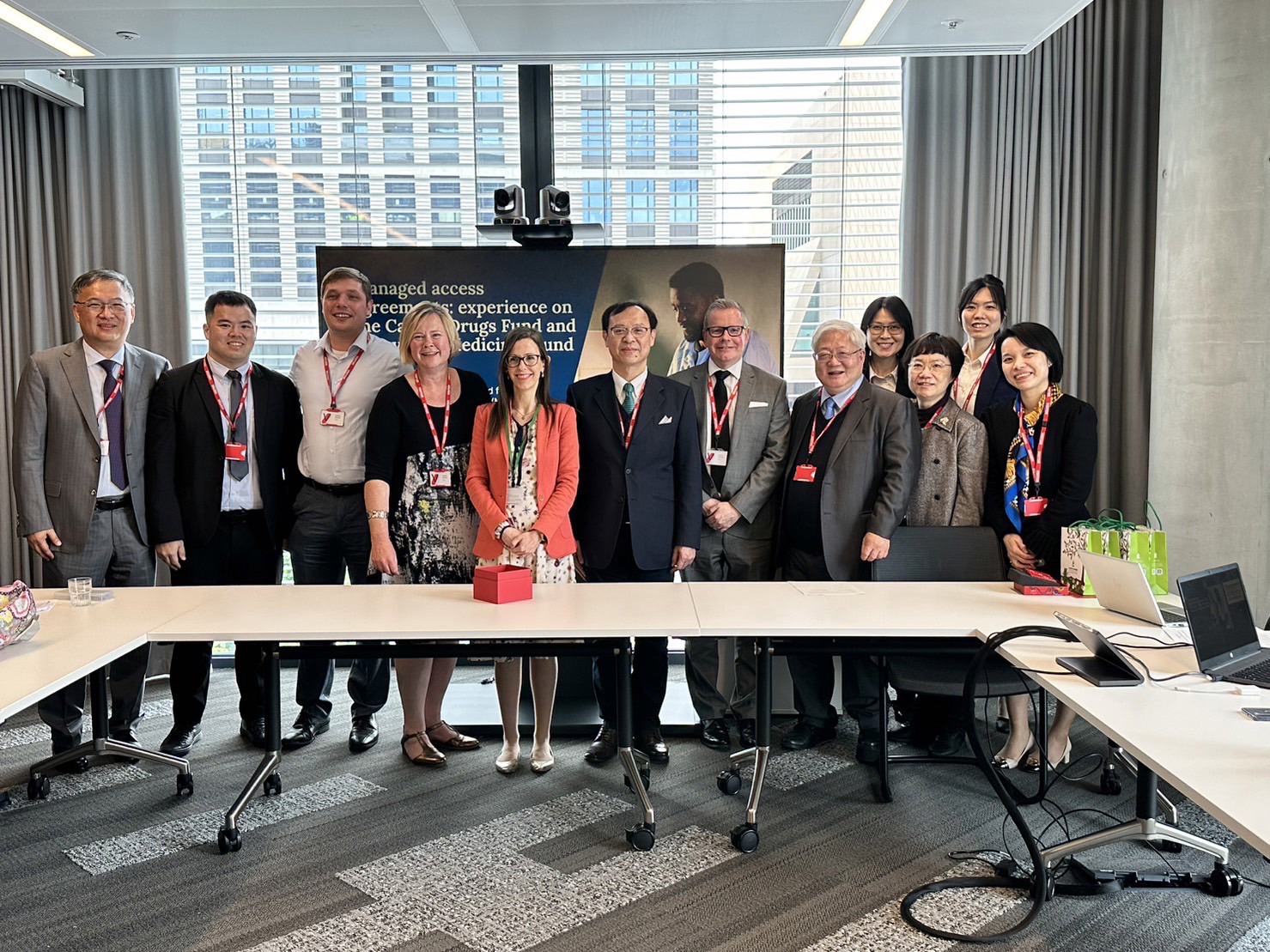 我代表團由衛生福利部健保署石崇良署長、國民健康署吳昭軍署長,以及查驗中心林時宜執行長帶領,於2023年5月18日拜訪英國國家健康暨照護卓越研究院(National Institute for Health and Care Excellence, NICE)與其主管及英國國民健康服務署(National Health Service, NHS)官員,就創新藥物基金(Innovative Medicines Fund, IMF)及癌藥基金(Cancer Drugs Fund, CDF)運作模式、醫療科技評估(HTA)方式、藥品給付協議 (Managed entry agreements, MEAs)等議題進行交流,並由健保署署長石崇良、林時宜執行長和英國NICE於5月18日共同簽署合作協定,未來將深化雙方資訊交流及人員訓練與合作,以提升應用醫療科技評估(HTA),精進以價值為導向的新藥給付審議流程,將資源用在刀口上,提升病人用藥可近性。