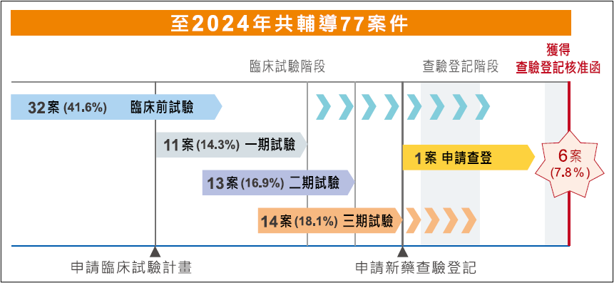 為呈現藥品指標案件之輔導成果,依藥品開發歷程設定以下五個輔導成果里程碑:通過臨床試驗申請案進入一期臨床試驗、通過臨床試驗申請案進入二期臨床試驗案、通過臨床試驗申請案進入三期臨床試驗、申請新藥查驗登記、獲得查驗登記核准函、及上市後研究核准。