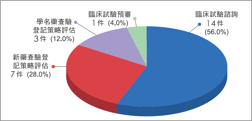 2024年藥品付費諮詢案件結案計有25件。以案件類別區分,臨床試驗諮詢14件,新藥查驗登記策略評估7件,學名藥查驗登記策略評估3件,臨床試驗預審1件。案件數及所占百分比如下圖。