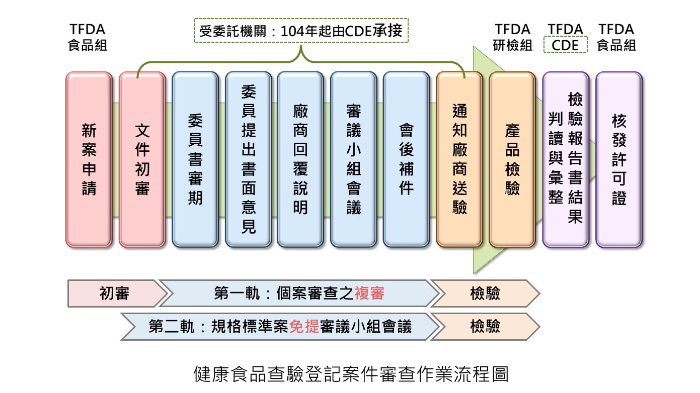 健康食品查驗登記審查採雙軌制,第一軌個案審查、第二軌規格標準審查。自104年7月1日起第一軌個案審查分為「初審」、「複審」兩階段審查技術性資料。