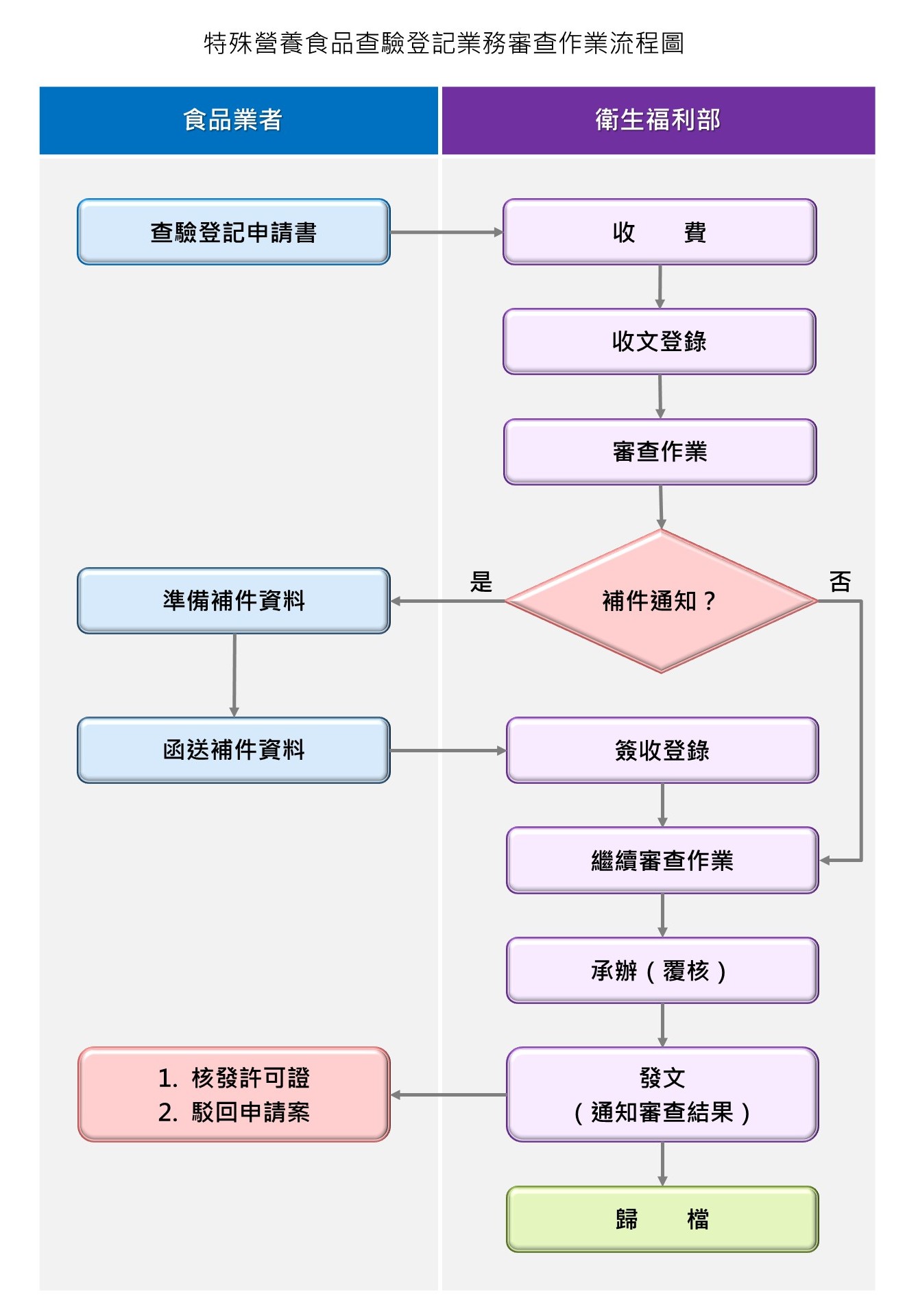 - 結果判讀與彙整:由查驗中心根據產品檢驗及標籤包裝審查結果綜合評估後,彙整相關文件交由食藥署裁定案件准駁,後由衛生福利部核發許可證或駁回申請公文給廠商。