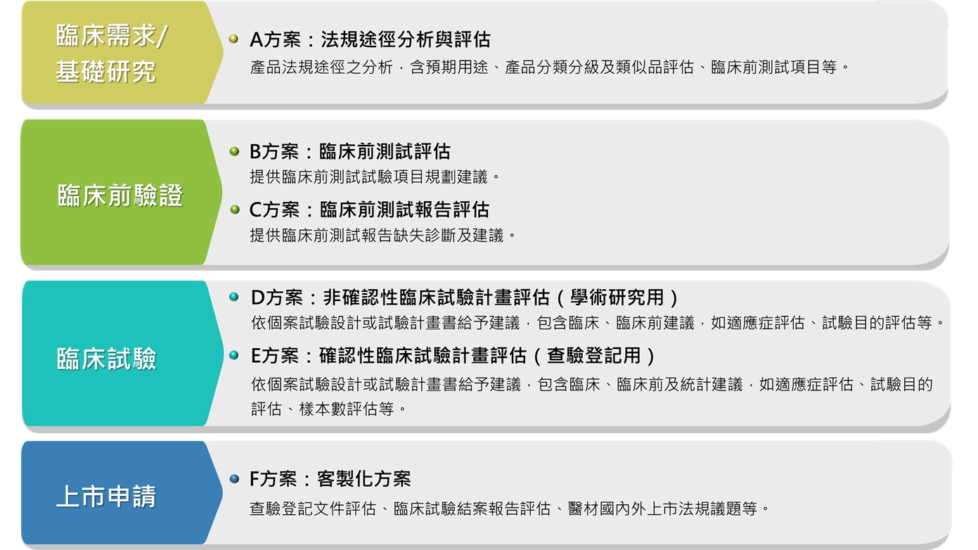 醫療器材組付費諮詢方案配合醫療器材開發期程,從產品研發初期到上市驗證資料的準備,針對臨床前測試規劃、臨床試驗設計及查驗登記文件等法規要求,提供各階段之諮詢服務,各方案服務內容請見下表說明:
