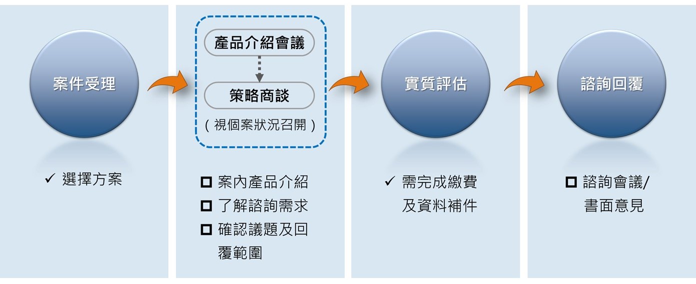- 申請方完成諮詢費用繳納、技術性資料補充後,案件則進入實質評估,並於約定時程提供書面意見及召開諮詢會議。